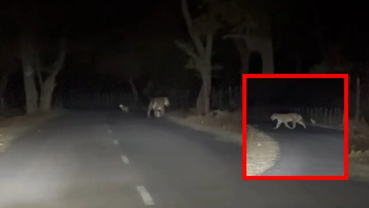 The incident unfolded on the Jwaleshwar Marg near Amarkantak. Yogesh Bisen, a teacher, was driving back home with his family on the night of February 5 when they encountered the majestic tiger striding confidently down the road. What made the sighting even more remarkable was the jackal trailing closely behind, seemingly unperturbed by the presence of its much larger counterpart.